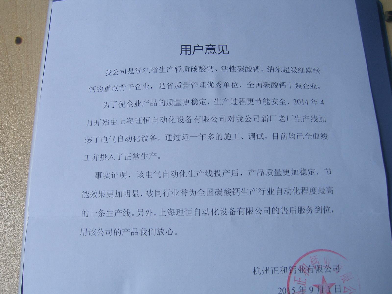 下圖為該碳酸鈣生產(chǎn)廠家出具的對(duì)我公司的設(shè)計(jì)、編程、施工及售后服務(wù)的高度評(píng)價(jià)的“用戶意見(jiàn)書(shū)”