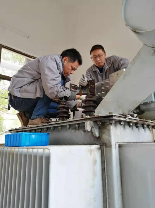 我司技術(shù)人員爬在中興能源裝備有限公司新增的污水雨水處理工程的變壓器上全神貫注地進行銅排安裝。