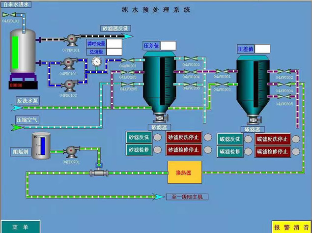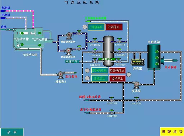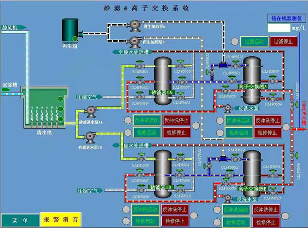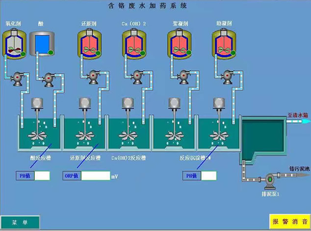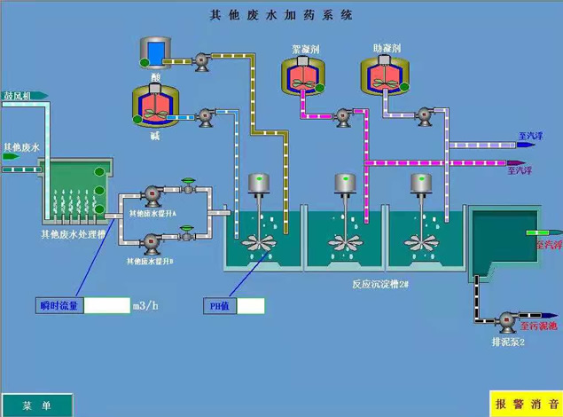這是在主控室我司制作的針對該企業(yè)在生產(chǎn)過程中產(chǎn)生的污染廢水處理的PLC編程操作畫面
