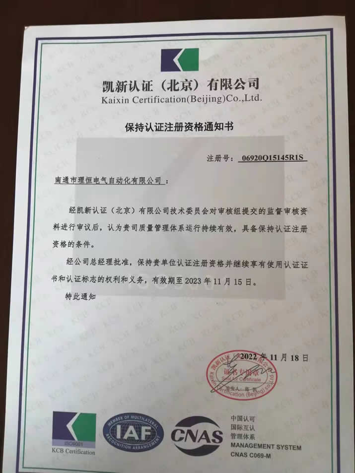 近日,經(jīng)中國質(zhì)量管理體系凱新認(rèn)證(北京)公司技術(shù)委員會(huì)專家組人員對(duì)我司質(zhì)量管理體系進(jìn)行監(jiān)督審核,我司質(zhì)量管理體系運(yùn)行持續(xù)有效,并給我司頒發(fā)了《保持認(rèn)證注冊(cè)資格通知書》。