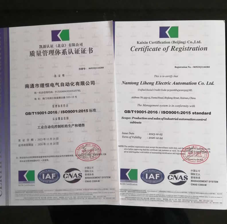 前不久,經(jīng)中國質(zhì)量認(rèn)證中心有關(guān)專家的現(xiàn)場檢查復(fù)核,認(rèn)定我司工業(yè)自動(dòng)化控制柜的生產(chǎn)和銷售體系符合GB/T19001-2016/ISO9001:2015標(biāo)準(zhǔn),并給我司頒發(fā)了認(rèn)證證書。