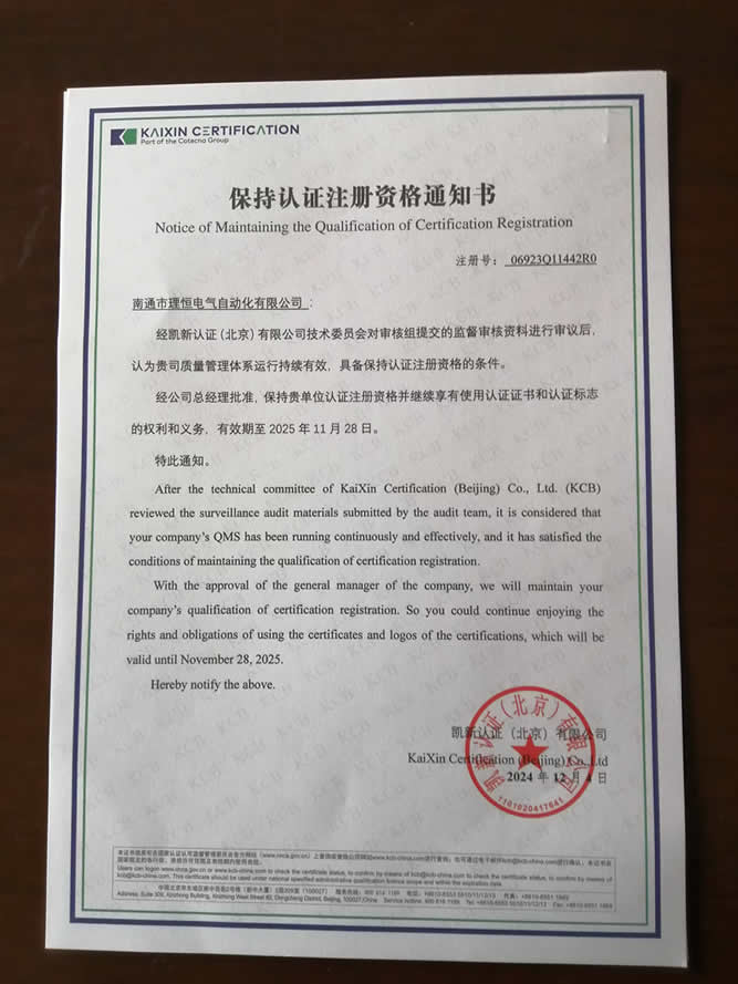 日前,我司收到國家質(zhì)量管理認(rèn)證中心發(fā)來的通知書,經(jīng)專家驗(yàn)收,我司繼續(xù)保持認(rèn)證注冊(cè)資格,并繼續(xù)享有使用認(rèn)證證書和認(rèn)證標(biāo)志的權(quán)利和義務(wù)。